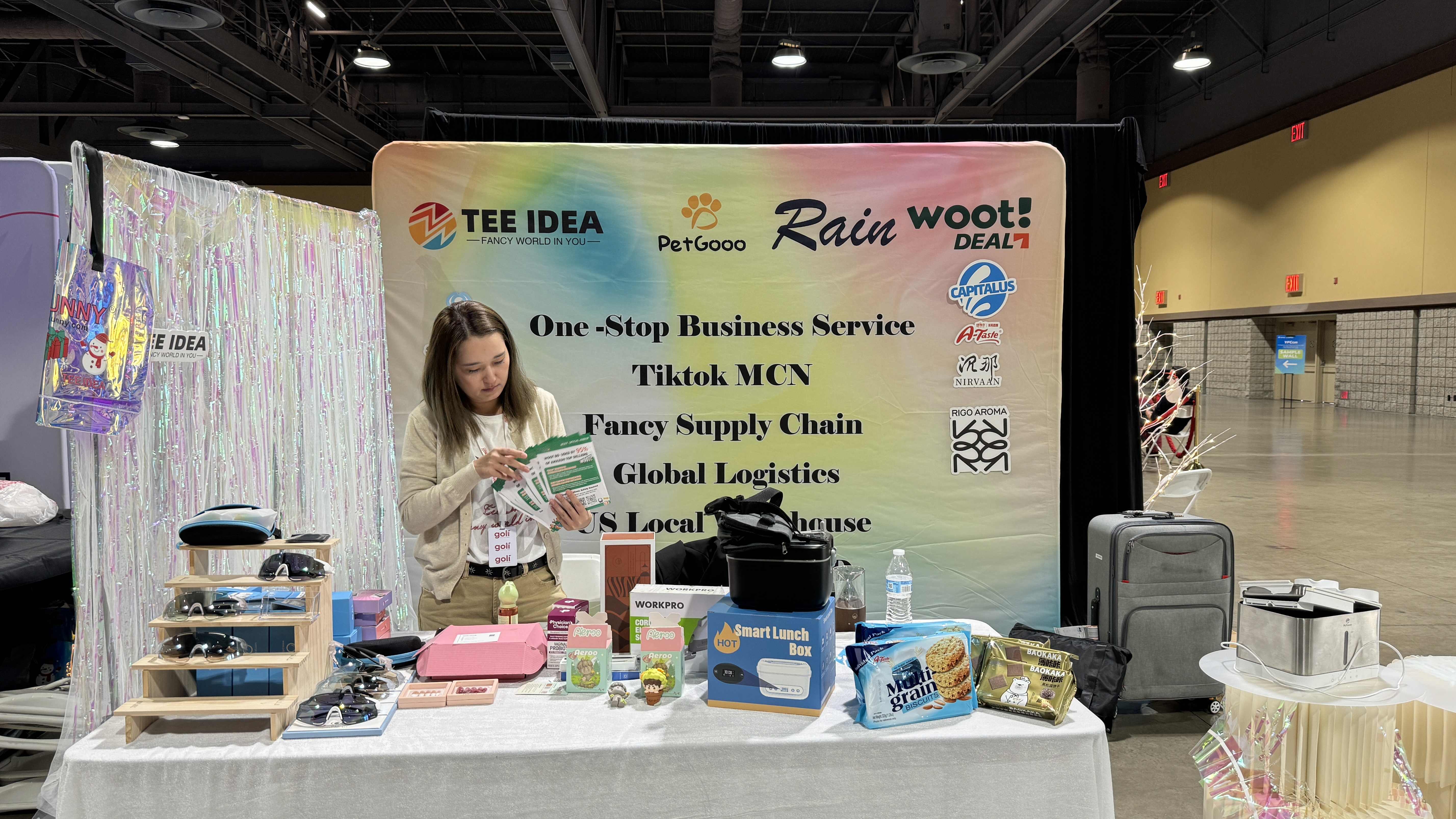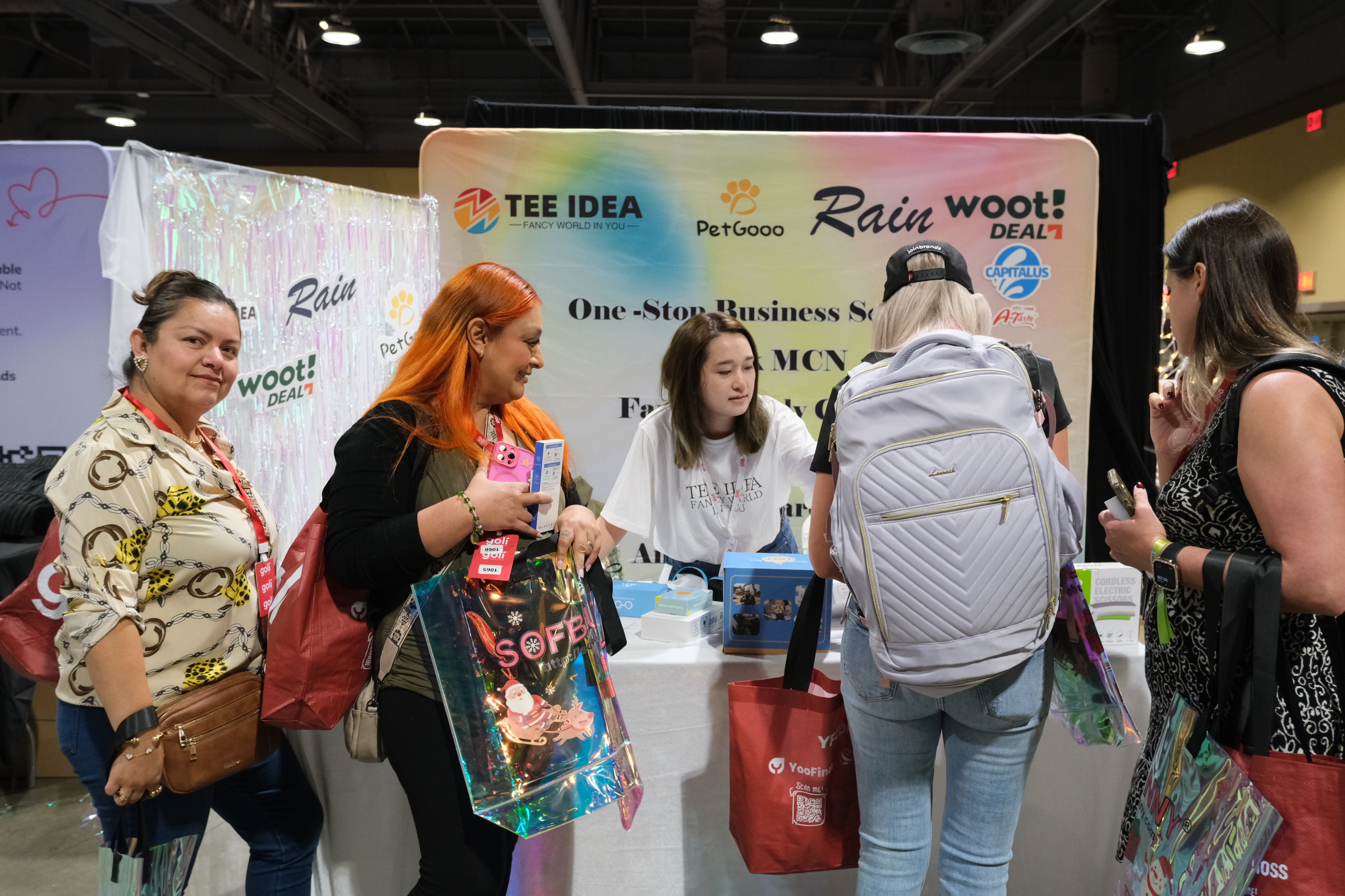 由 YooFinds 主办、FastMoss 协办的 YFCon 美国短视频 & 直播生态达人线下选品展览会 已于 10 月 15–16 日在洛杉矶长滩会展中心举行。我们在现场以 TEE IDEA · Rain · WOOT DEAL 联合展出的形式亮相,围绕“一站式业务服务、TikTok MCN、Fancy 供应链、全球物流、美国本地仓”等能力进行集中展示,并与现场达人与品牌进行深度交流。